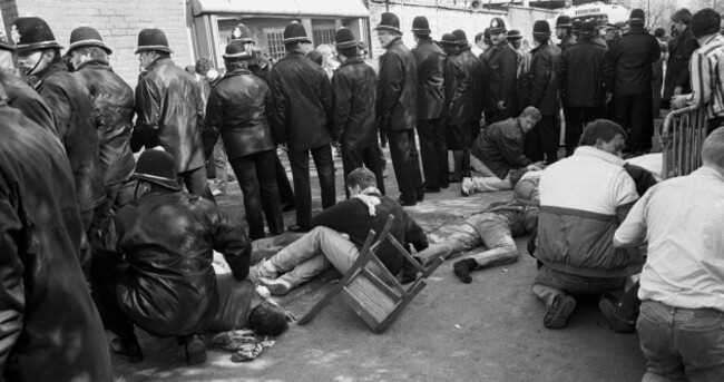 A line of Policeman shield some injured fans as they receive treatment at Hillsborough in 1989. PA Photos/PA Archive/Press Association Images