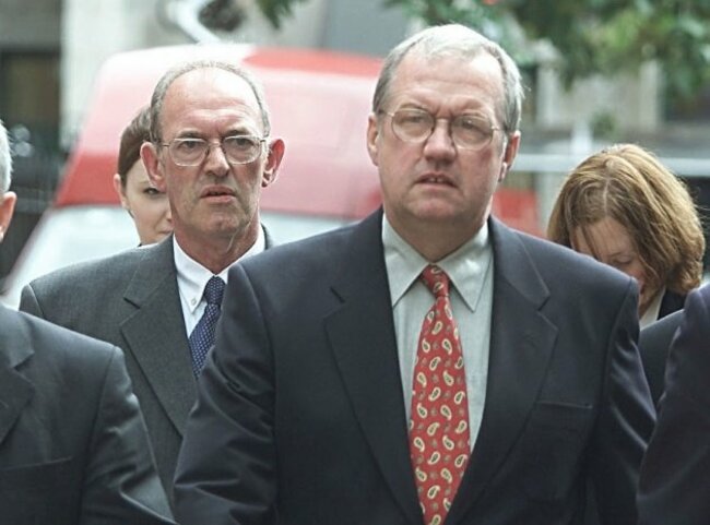 Retired police officer Bernard Murray and former police officer David Duckenfield (F) leave Leeds Crown Court during their trial in 2000. Pic: Owen Humphreys/PA Archive/Press Association Images