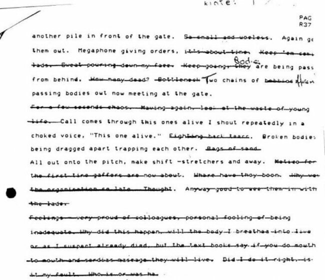 In documents disclosed by the panel you can see the wholesale crossing out of Frost’s account of the day which ran to 16-pages. By contrast his redacted statement is just six-pages and cuts down on much of his description of what he saw that day. His was one of just 116 statements that were altered.