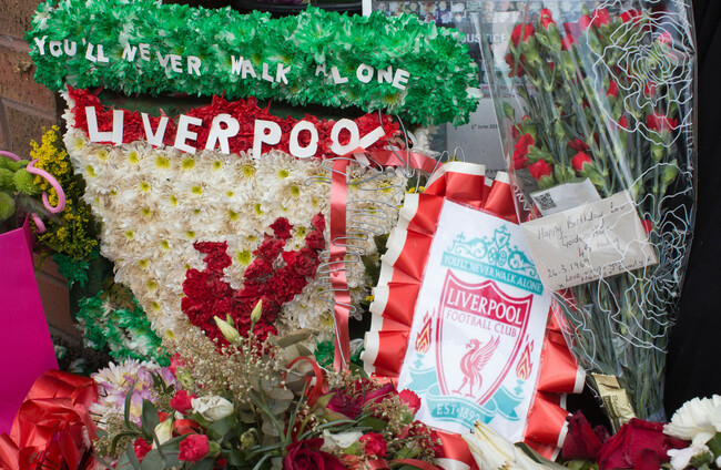 File image of tributes for the 97 fans who died at Hillsborough disaster outside Anfield Alamy Stock Photo