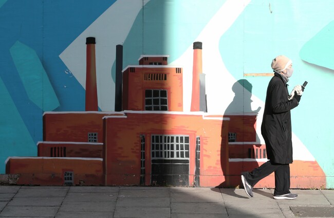 A woman wearing a face mask passes the Guinness mural on Thomas Street in The Liberties. PA Images