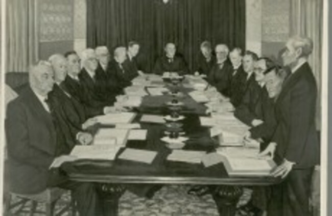Photograph of Simon Coleman's painting of the first meeting of the Council of State on 8 January 1940 Tierney/MacNeill collection, courtesy of UCD Archives and UCD Digital Library