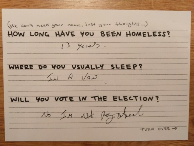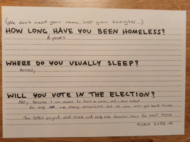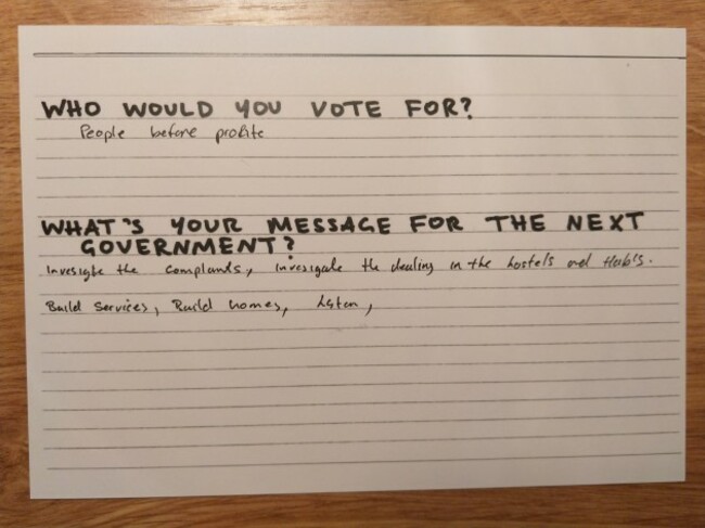 Cummings was one of two volunteers who helped people fill in TheJournal.ie’s Homeless Postcards, which asked questions about voting habits and messages for the next government.