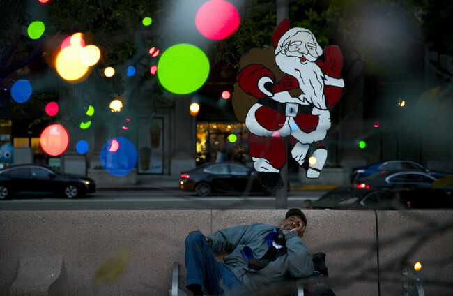 Homeless man Alonzo Harrison, 47, takes a nap on a bench at Pershing Square decorated with Christmas lights in the background in LA. Jae C. Hong/AP Photo