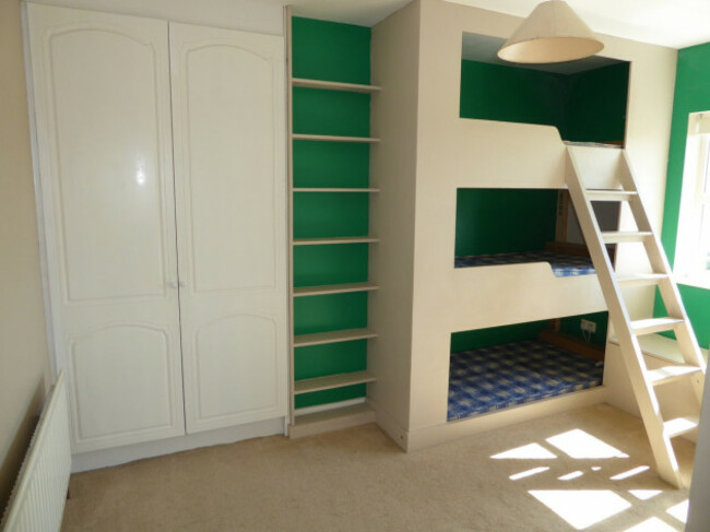 The spacious entrance hallway leads into a lounge with an open fireplace and bay window. The kitchen/dining room has patio doors onto the garden. Upstairs, the three bedrooms include fitted wardrobes, and one room has fitted bunk beds for three little ones to enjoy.
