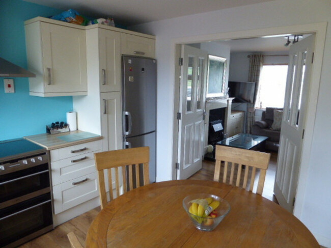 The entrance hallway boasts pull-out understair storage units, and the lounge has a solid fuel stove for added ambience and warmth. The dining room is attached the kitchen, which is fully fitted with integrated hob and oven, and offers patio doors onto the garden.