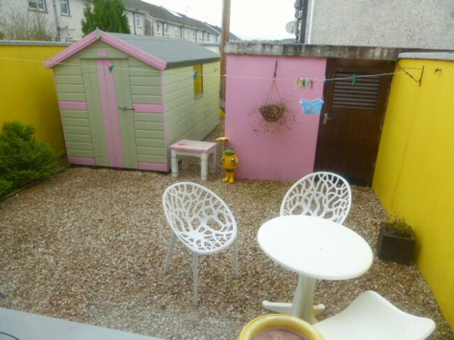 The lounge here has an open fireplace that’s fitted with an electric fire; double doors lead into the kitchen/dining room. Each bedroom has built-in wardrobes for added storage. The main bathroom is on the first floor as well. The back garden is painted in a cheerful yellow and has a separate shed.