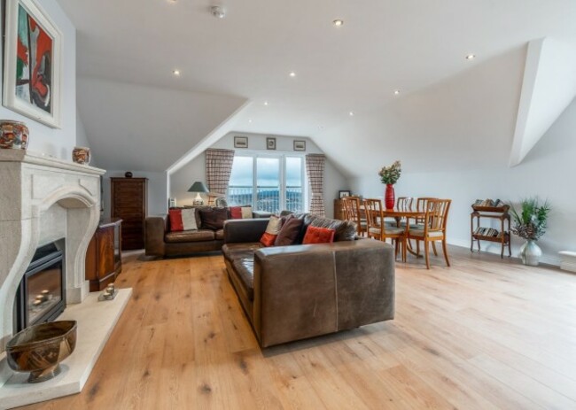 With views across Dublin Bay and towards Killiney Hill, this two-bedroom penthouse apartment is bright and spacious. It is located at the top of the Stepaside Park development, surrounded by landscaped grounds. Complete with two balconies – one accessed from the living space, one from the second bedroom – the accommodation itself is centred around a living and dining area, with a separate kitchen and breakfast room.
