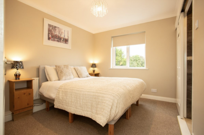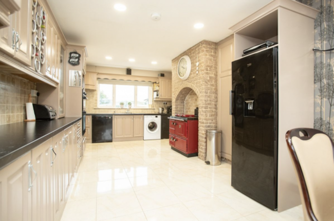 This four-bed, detached dormer bungalow stands on almost an acre in Ballinhassig near Cork City, Bishopstown and Kinsale. The property features spacious living space ideal for a growing family. The ground floor includes a large living room with bay windows, a dining room, kitchen, utility room, a guest toilet and an L-shaped bedroom with patio access. Upstairs, you’ll find three more bedrooms, including a main bedroom with an en suite bathroom as well as a family bathroom.