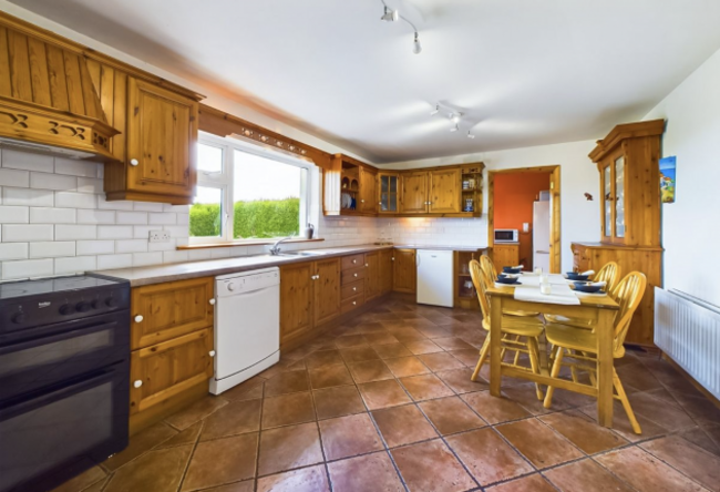 Another dormer-style home, this house is set on 1.28 acres, offers stunning sea views. It’s located just 1.5 km from the picturesque fishing village of Dunmore East. The property is surrounded by mature lawns and natural stone walls, accessed by a sweeping driveway. Ideal for equestrian enthusiasts, it includes two stables. Inside, the bright family home features a tiled entrance hall, a living room with solid wood floors and an open fireplace and a large sitting room with a wood-burning stove and double doors leading to the garden.