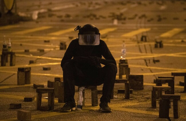 A protester sits with brick obstacles and Molotov cocktail on a barricade road near the Hong Kong Polytechnic University. Ng Han Guan/AP/Press Association Images