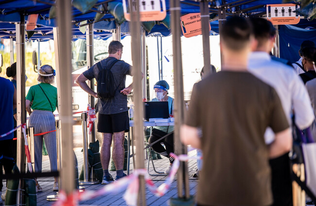 Hong Kong residents queue at a mobile Covid-19 testing station on Tuesday. Alamy Stock Photo