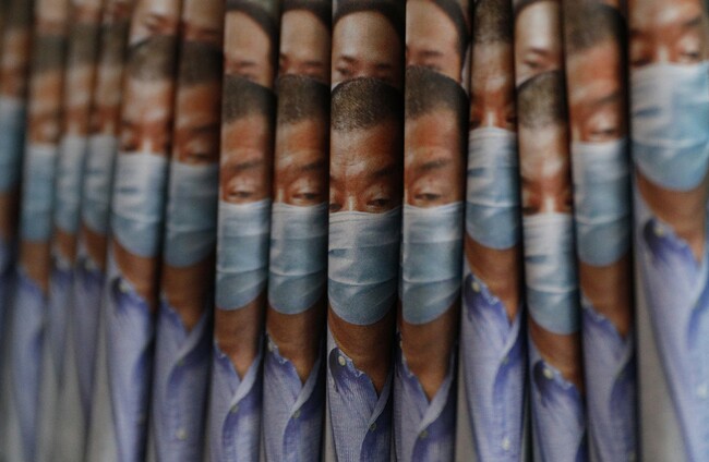 Copies of the Apple Daily newspaper, with front pages featuring Hong Kong media tycoon Jimmy Lai. Kin Cheung