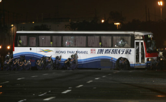 Philippine police prepare to storm the hijacked bus in Manila. Bullit Marquez/AP/Press Association Images