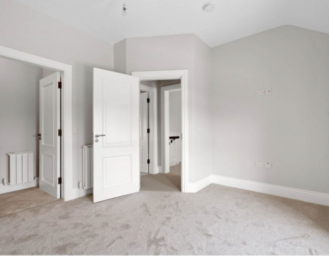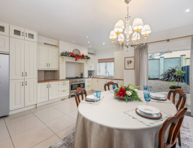 3 Meadow View in Carrigaline is an exceptional four-bed townhouse extending to 168 m² and presented in true turnkey condition. Finished to show-home standard, this spacious three-storey house offers bright, well-balanced accommodation ideal for modern family living. The ground floor features a welcoming entrance hall, guest toilet and a generous front sitting room with double doors leading to a stylish, fully fitted kitchen and dining area complete with floor-to-ceiling units and a gas cooker.