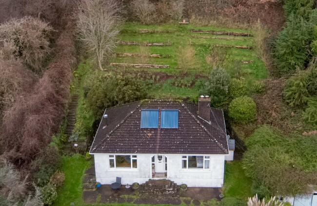 The home has a living room and kitchen/dining room alongside three bedrooms, two of which have their own stove or fireplace. It sits on a tiered site with an attractive garden area on a higher level behind the house, as well as a smaller front garden and a garage to the side.