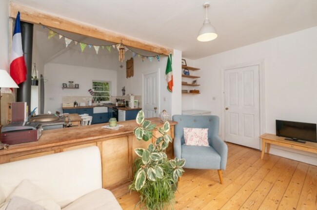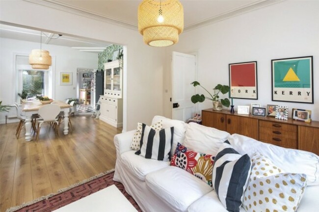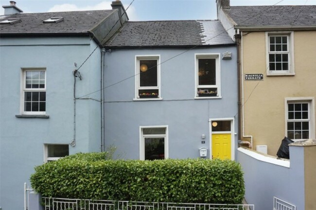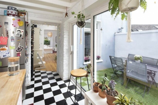 The three-bedroom house at 2 Magnolia Terrace a short walk from Cork city centre has been thoughtfully renovated and decorated to create a family home full of character. On the ground floor, a sitting room and dining room have been combined into one bright open-plan space. This leads onto a contemporary kitchen with distinctive chequerboard tiles and a large window onto the patio.