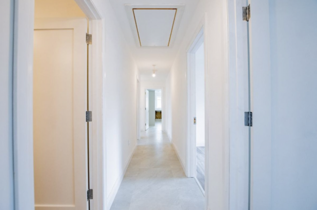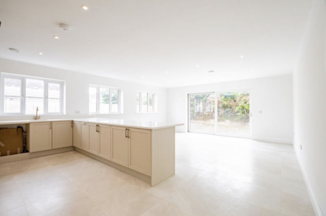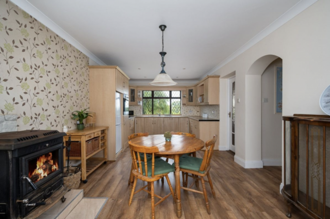 This six-bed detached dormer bungalow sits on an elevated, landscaped site of nearly half an acre. The property offers privacy and charm, accessed through a gated entrance and a sweeping driveway. The 206 m² home has bright, spacious rooms across two floors. The ground floor features a striking double-height entrance hall, a cosy sitting room with an open fire and a modern open plan kitchen with dining area that’s home to a solid fuel stove.