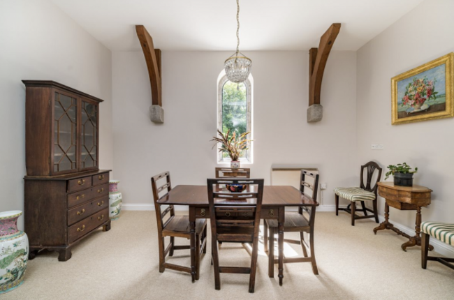 A truly unique find close to Charleville Castle and Estate, St. Bartholomew’s is a converted 19th century chapel that blends architectural splendour with modern comforts. This 203 m², three-bed home exudes character, starting with its stone facade and arched wooden doors leading to a light-filled entrance hall featuring stained glass and a dramatic staircase. The drawing room impresses with its triple-aspect arched windows, timber beams and Victorian marble fireplace, while the breakfast room and kitchen showcase tasteful decor and open plan charm.