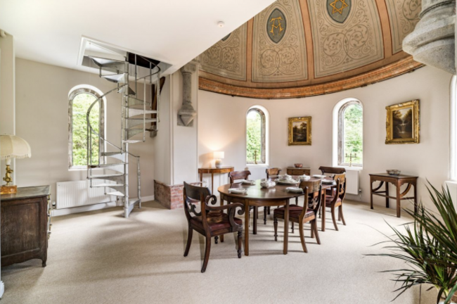 A highlight is the dining room, with a domed ceiling adorned with gilded script, a spiral staircase and enchanting arched windows. Upstairs, vaulted ceilings and Velux roof lights illuminate the bedrooms, and there’s a handy Jack-and-Jill en suite bathroom. Outdoors, enjoy a stone patio, greenhouse and dual garages. Just 4 km from Tullamore and over an hour  from Dublin, this special home mixes history, elegance and tranquillity.