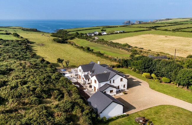 The south-facing gardens are landscaped with native planting, manicured lawns and a small stream adding to the tranquillity. The granite-paved patio offers multiple seating areas and direct access to the heated swimming pool that’s all set against a backdrop of rolling fields that slope down to the sea.