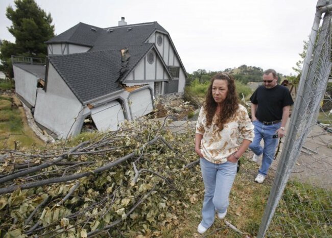 Robin and Scott Spivey walk past the wreckage of their Tudor-style dream home they had to abandon when the ground gave way causing it to drop 10 feet below the street in Lakeport. (AP Photo/Rich Pedroncelli)