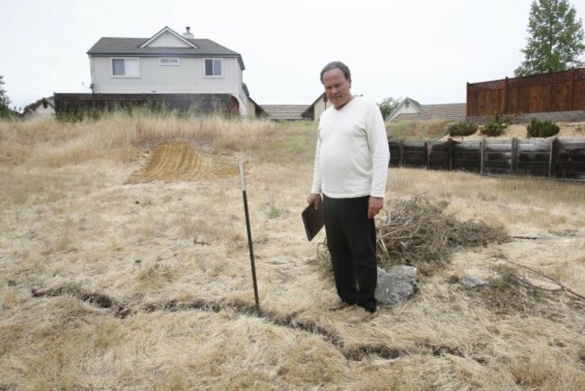 Randall Fitzgerald checks a fissure that has opened in a lot near his home in the Lakeside Heights subdivision in Lakeport. Fitzgerald, who bought his home a year ago, has seen several of his neighbours move away as the sinking ground threatens the collapse of their homes, and is concerned that he will have to leave as more fissures appear. (AP Photo/Rich Pedroncelli)