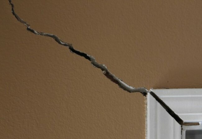 A crack in the wall of  the home of Jagtar Singh  in Lakeport, Calif.  Shortly after Singh moved his wife, four-year-old daughter and his parents, the hill behind his home collapsed. (AP Photo/Rich Pedroncelli)