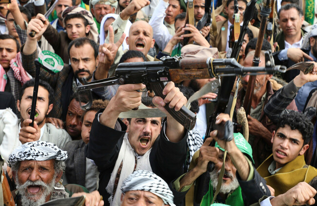 Houthi supporters chant slogans during a weekly anti-Israel rally in Sanaa, Yemen, on Friday. Alamy Stock Photo