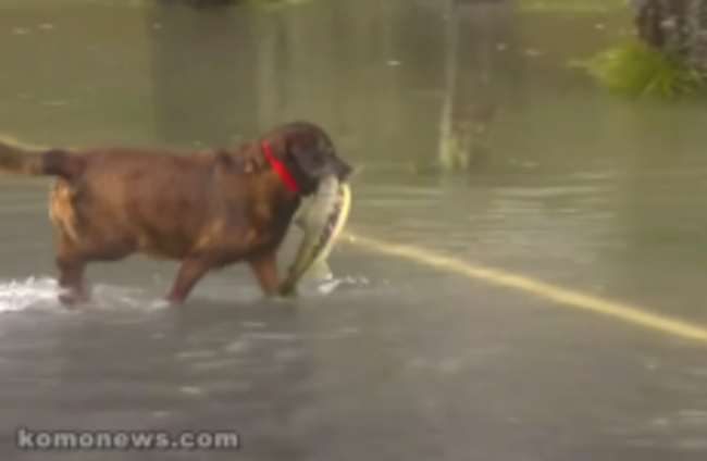 However one salmon didn’t make it after it was caught by a dog, this video from KOMO-TV would suggest.