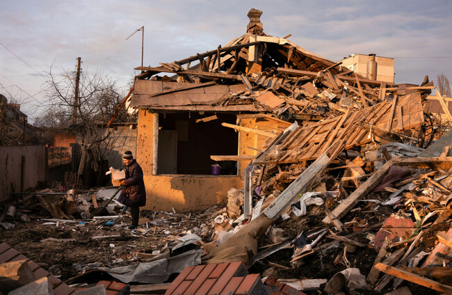A man removes belongings from a bombed house in the town of Chugugyv, on the outskirts of Kharkiv in February. Alamy Stock Photo
