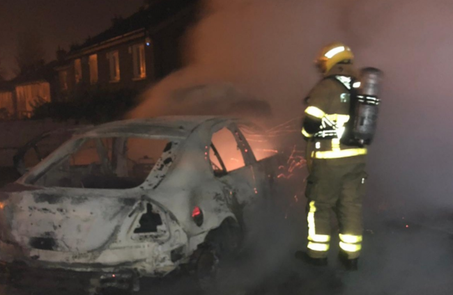 Firefighter in breathing apparatus extinguishing a car fire in South Dublin on Halloween. Dublin Fire Brigade/Twitter