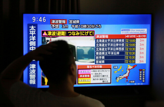 A TV news program reports the issuance of tsunami warnings accross Japan. Alamy Stock Photo