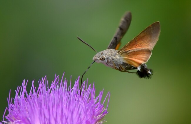 Hummingbird hawk-moths hover at flowers as they feed on the nectar, their wings beat rapidly making a humming sound and they have large eyes to help them find the best flowers. Their long hollow tongues also look like the beak of a hummingbird.