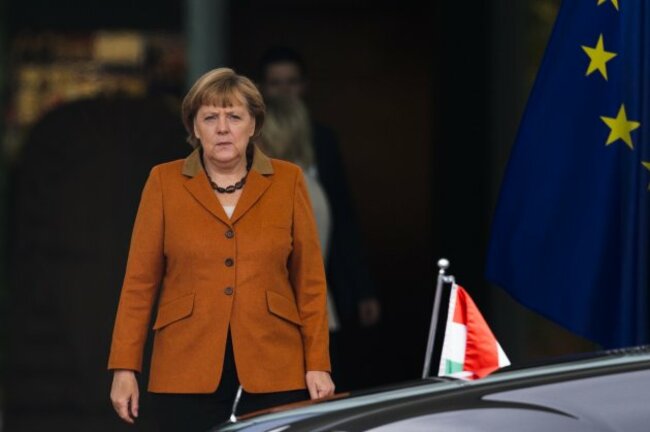 German Chancellor Angela Merkel leaves her office to welcome Hungarian Prime Minister Viktor Orban for talks in Berlin today.