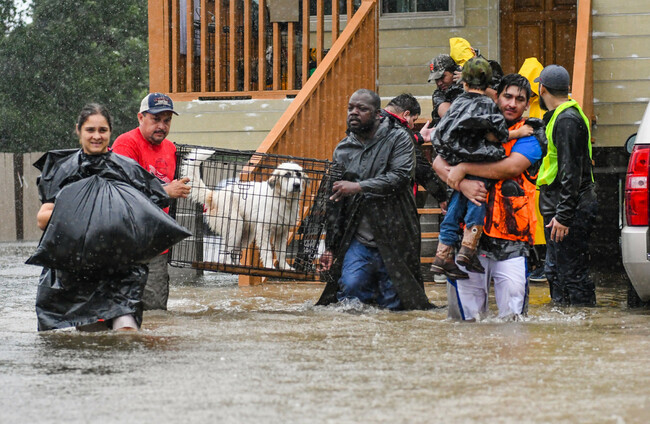 Volunteers and First Responders help flood victims evacuate to shelters in Houston, Texas. SIPA USA/PA Images