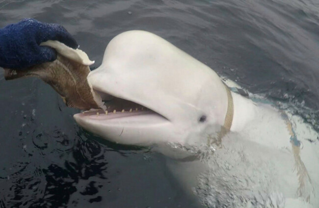 A photo from April 2019 showing the beluga whale, nicknamed Hvaldimir, being fed. Alamy Stock Photo