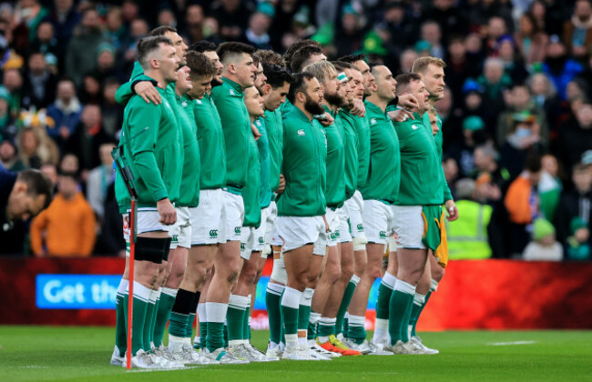 Ireland players stand for the anthems before the match against Italy at the Aviva Stadium Billy Stickland / INPHO Billy Stickland / INPHO / INPHO