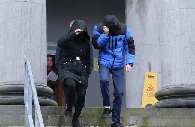 Patrick O'Brien (right) covers up as he leaves Tralee District Court. PA