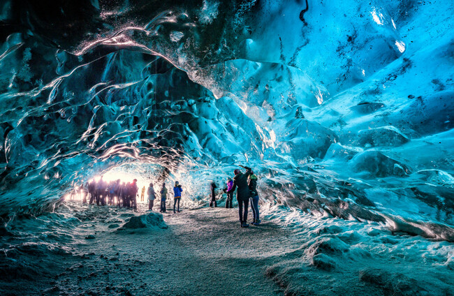 Tourists in The Crystal Cave, Breidamerkurjokull Glacier, Iceland. Alamy Stock Photo