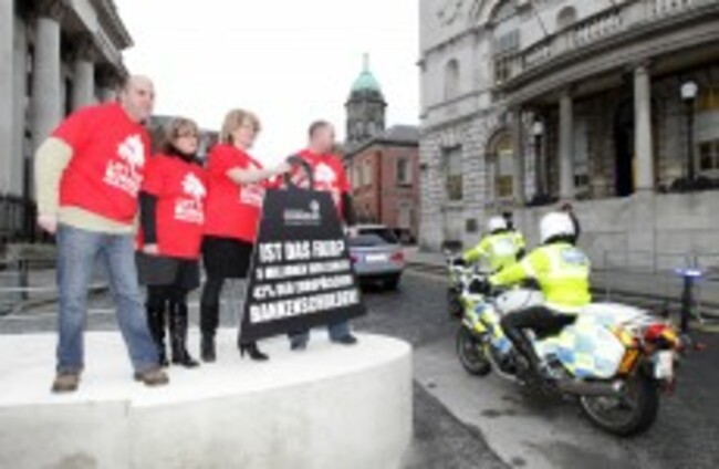The Irish Congress of Trade Unions is holding coordinated ‘Not Our Debt’ protests in the country’s five cities and in Sligo to protest at the nationalisation of banking debts – particularly following the promissory note arrangement which will see former Anglo debts become official government debt.