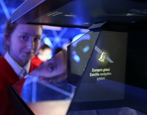 Shannon Hallissey (12) from Dublin looks at a digital satellite. (Sam Boal/Photocall Ireland)