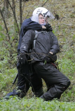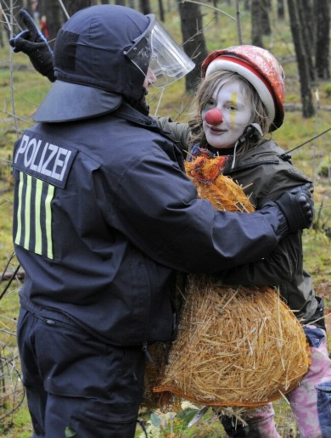 A policeman stops an anti-nuclear activist dressed as a clown during clashes near Leitstade, northern Germany, on Sunday, Nov. 7, 2010. Jens Meyer/AP/Press Association Images