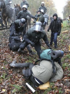 OVER 200 ACTIVISTS ATTEMPTING TO BLOCK the route of a train carrying nuclear waste into Germany have clashed with police along the railway line.
