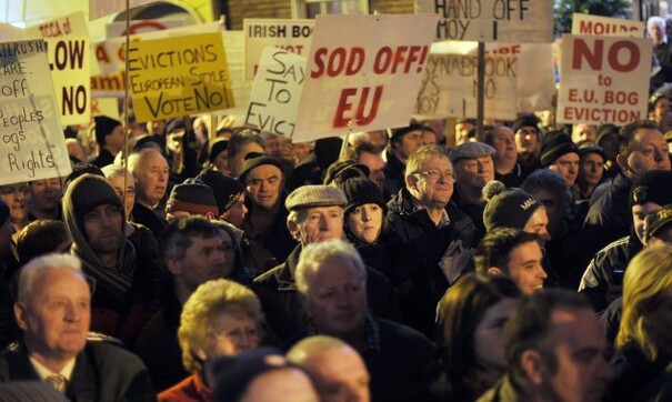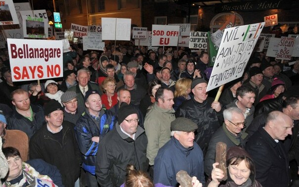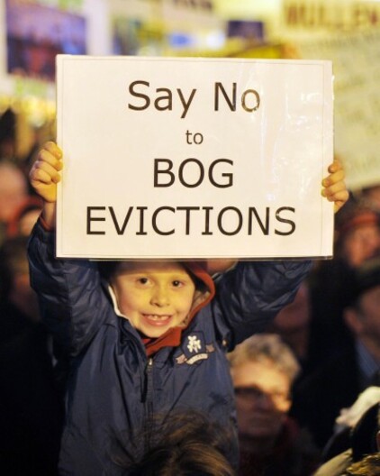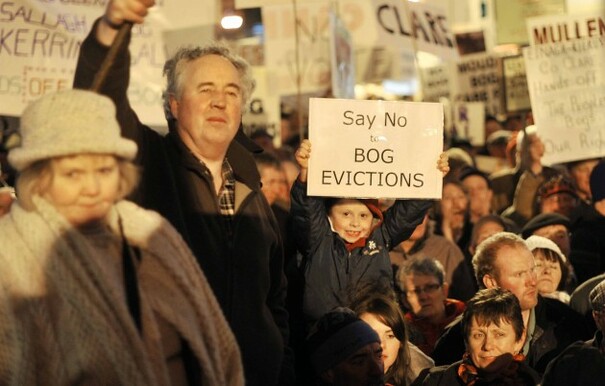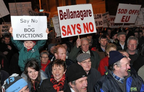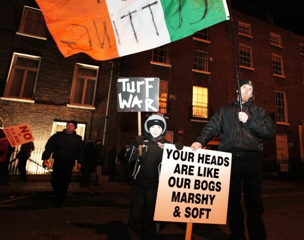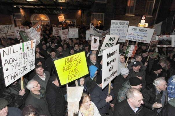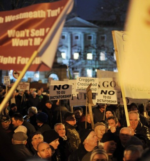 LARGE CROWDS GATHERED outside Leinster House tonight to demonstrate against the closure of 53 raised bogs to turf cutting.