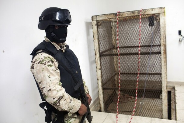 A Mexican army soldier stands next to an elevator shaft that lowers into the tunnel at the Tijuana end (AP Photo/Alex Cossio)