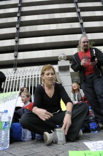 Upwards of a hundred protesters massed outside the Central Bank for the Occupy Dame Street event, which saw demonstrators bang pots and pans and hold placards calling for change.