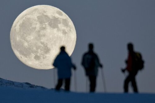 Three snow hikers watch the almost full moon rise behind the Weissfluhjoch in Arosa, Switzerland, Monday, Dec. 20, 2010. There will be a total lunar eclipse visible from Britain on Tuesday morning, when the Earth casts a shadow onto the Moon. On the day of the winter solstice, December 21, the full Moon will start to pass through the cone of Earth's shadow at 6.32 GMT. (AP Photo/Keystone, Alessandro Della Bella) Drei Schneeschuhwanderer schauen den Mondaufgang am Montag, 20. Dezember 2010 in Arosa. (KEYSTONE/Alessandro Della Bella)