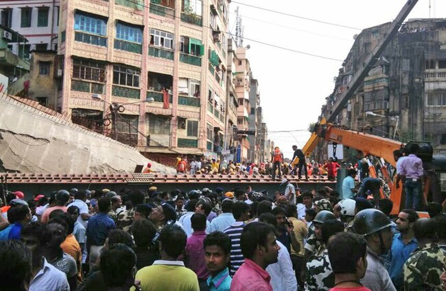 The flyover was under construction when a 100-metre (330-feet) section collapsed suddenly onto a crowded street in the eastern city of Kolkata around lunchtime, crushing pedestrians, cars and other vehicles under huge concrete slabs and metal.