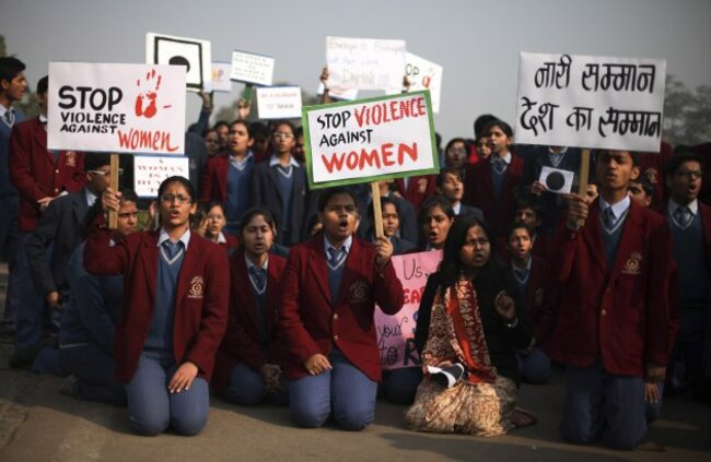 Indian schoolchildren hold placards as they participate in a protest in New Delhi. (Image: Altaf Qadri/AP/Press Association Images)